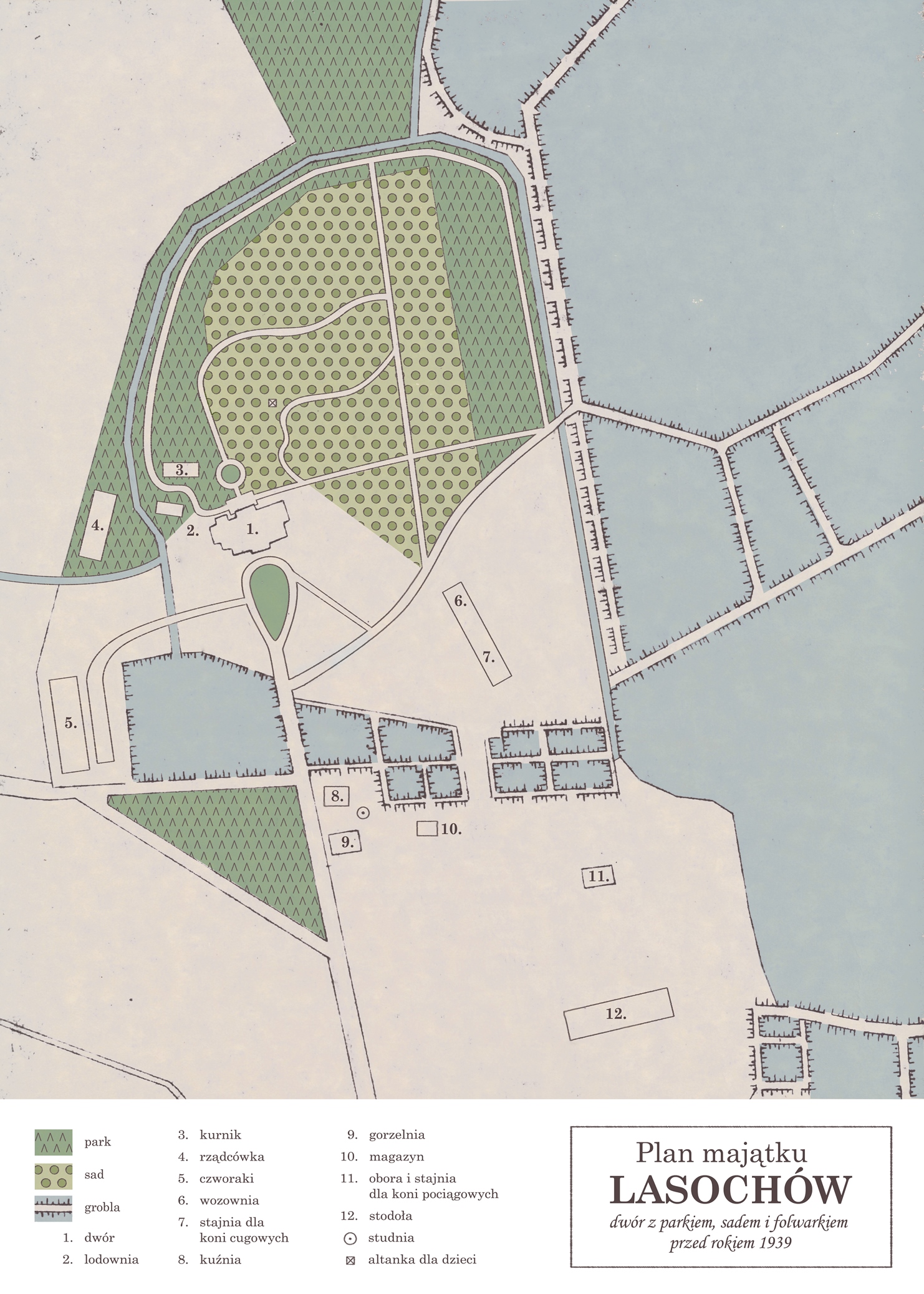 Ogrodowa elewacja dworu wychodziła na dużą polanę zamkniętą ścianą drzew rosnących nad rowem okalającym park, na której środku, na osi dworu, sytuowała się altana lipowa. Sieć alejek na terenie parku nie była rozległa: od prostokątnego placyku mieszczącego się przed północną elewacją budynku odchodziły trzy ścieżki. Jedna z nich prowadziła w prawo, do położonego we wschodniej części parku sadu, który przecinały z kolei dwie, prostopadłe do siebie drogi, założone na osiach północ-południe i wschód-zachód. Druga kierowała się w lewo – do pochodzącej z XIX w. piwniczki (lodowni) i dalej nad rowem na obwodnicę parkową. Trzecia, usytuowana na osi dworu i obsadzona różami, okalała owalny klomb, a następnie wiodła w prawą stronę, w kierunku brzozowej altanki zbudowanej specjalnie dla dzieci. Ich prawdopodobny, bo, niestety, niewidoczny już dziś układ obrazuje plan założenia wykonany na podstawie opisów pamiętających jeszcze przedwojenny Lasochów mieszkańców wsi. Ciekawostką, której udało się przetrwać zawirowania dziejowe, jest natomiast nagrobek ulubionego psa myśliwskiego właściciela Lasochowa, Antoniego Grabowskiego. Usytuowany w części parkowej w pobliżu dworu, ma on postać sporego kamienia z wyrytym nań napisem PRZYJACIEL TROP.